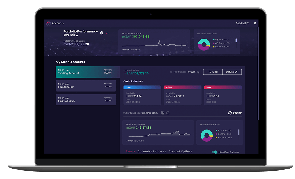 Backed by the Mesh Vault custody services, Mesh Accounts provide a secure platform to transact and store all your digital assets bought and sold through Mesh, and evaluate the PnL of your diversified portfolio.
