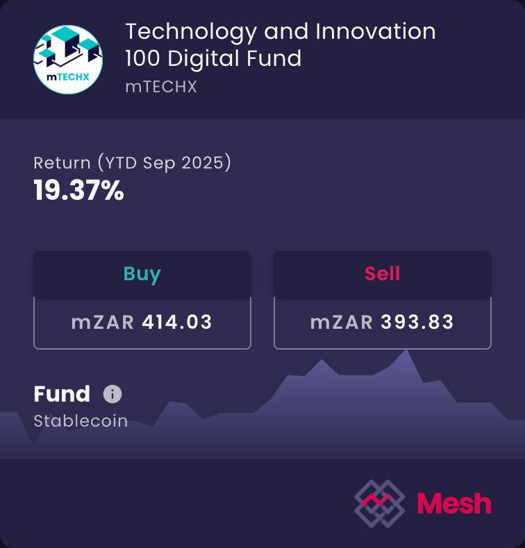 This web page is for informational purposes only and does not constitute investment advice, a solicitation, or an offer to invest in any foreign or local fund. Mesh-issued tokens provide price exposure to selected reference assets and do not represent ownership or participatory interests in any underlying fund or collective investment scheme. Investments involve risk, including possible loss of capital. Token values and yields may fluctuate; past performance is not indicative of future results. South African investors are exposed to USD/ZAR currency risk. Same-day access is subject to business-day cut-offs.