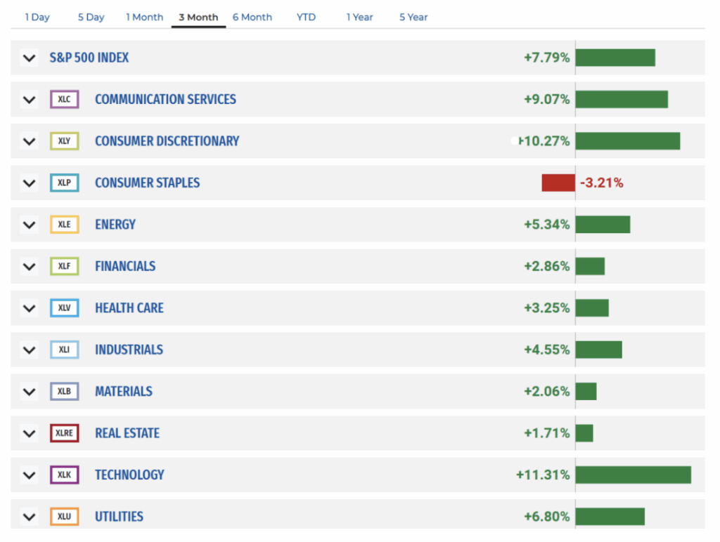 The market gained about 7.8% this quarter, but as you can see, it was just Communication Services (META, Alphabet) Consumer Discretionary (Amazon, Tesla) and the Technology sectors (Nvidia, Microsoft and Apple) that came in ahead of that.